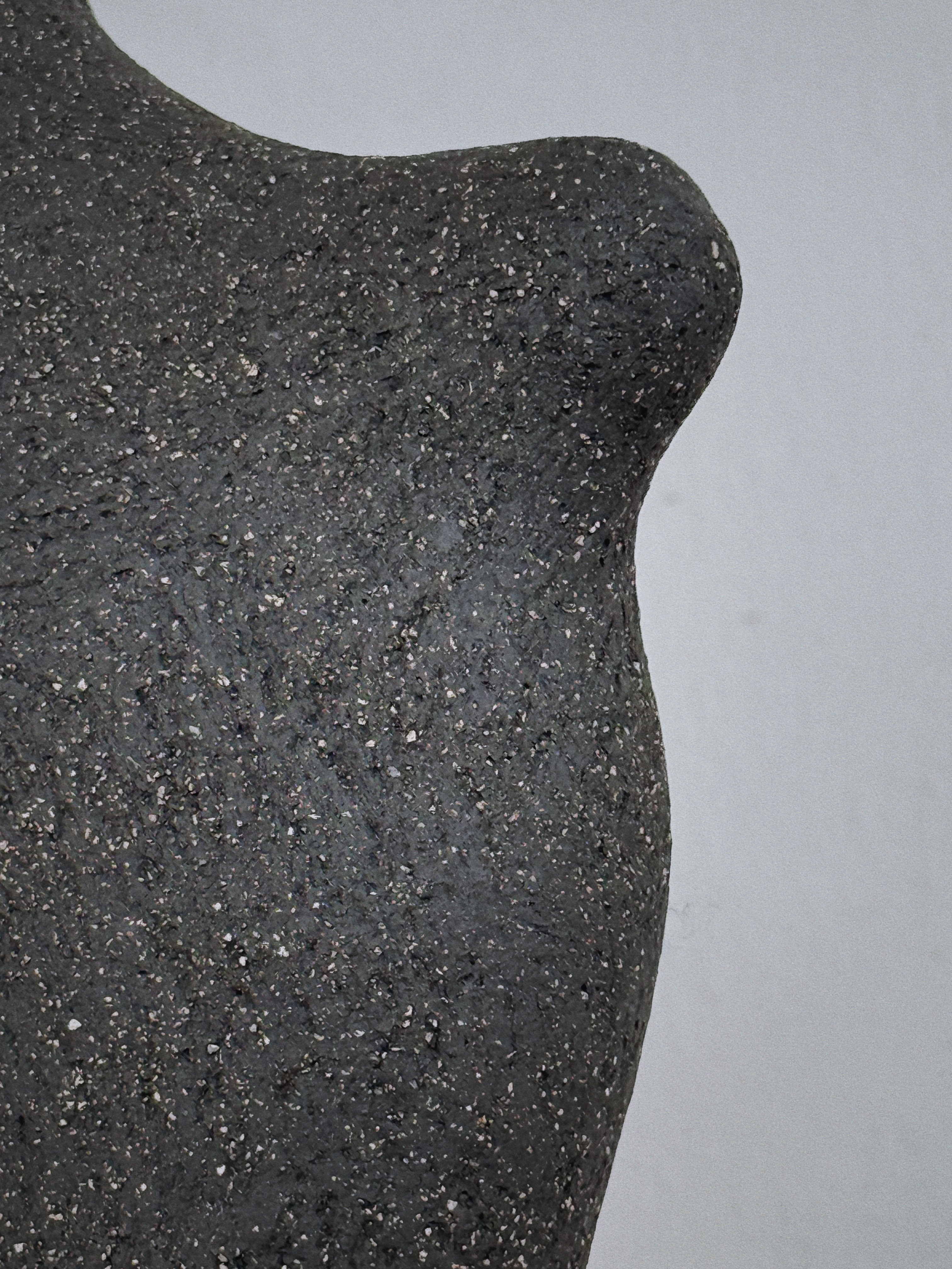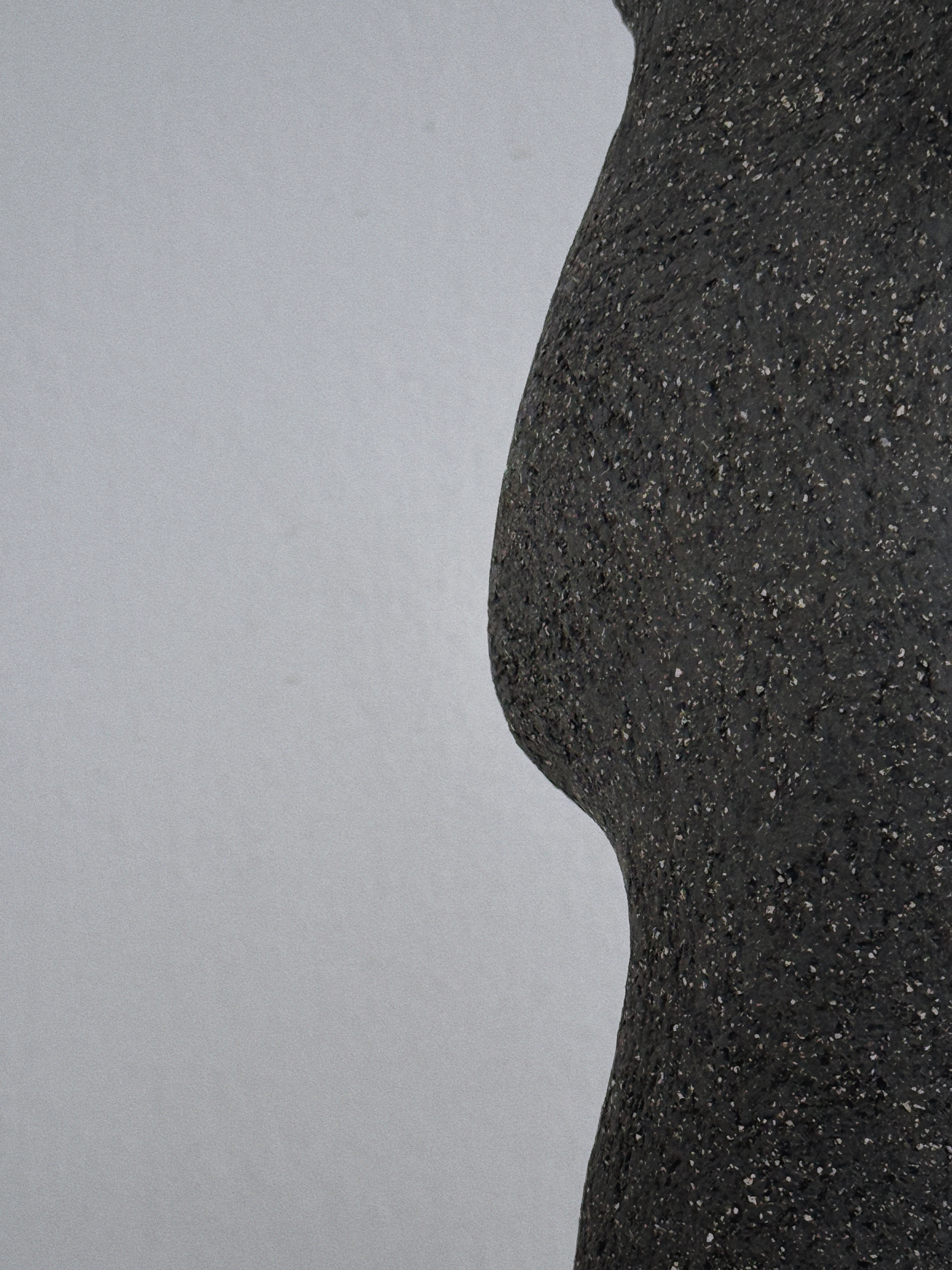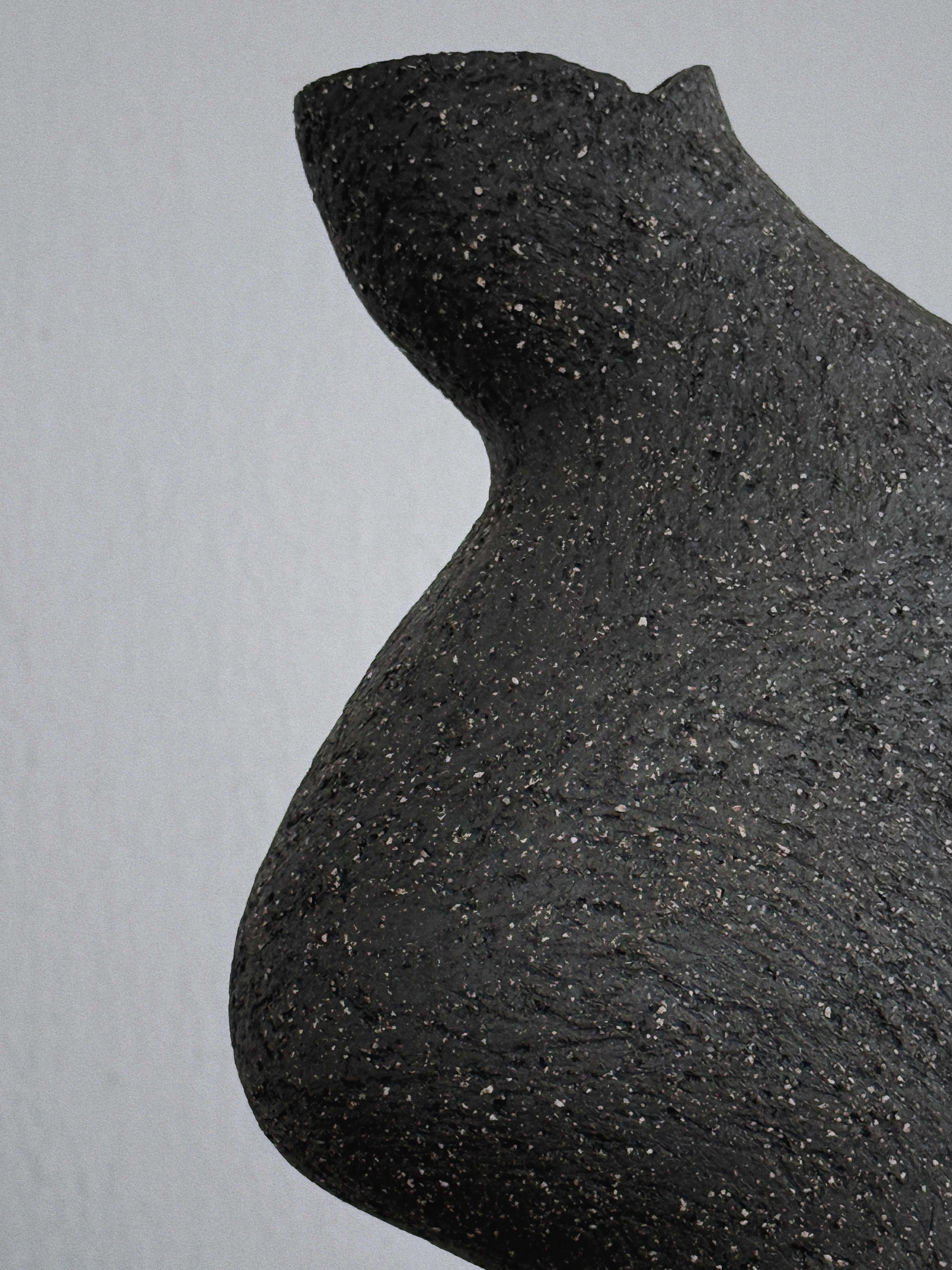 The posture leans forward in a heavy arch, shifting the center of gravity away from its narrow foundation. Dark, speckled grit coats the mass, anchoring the visual weight of the silhouette.