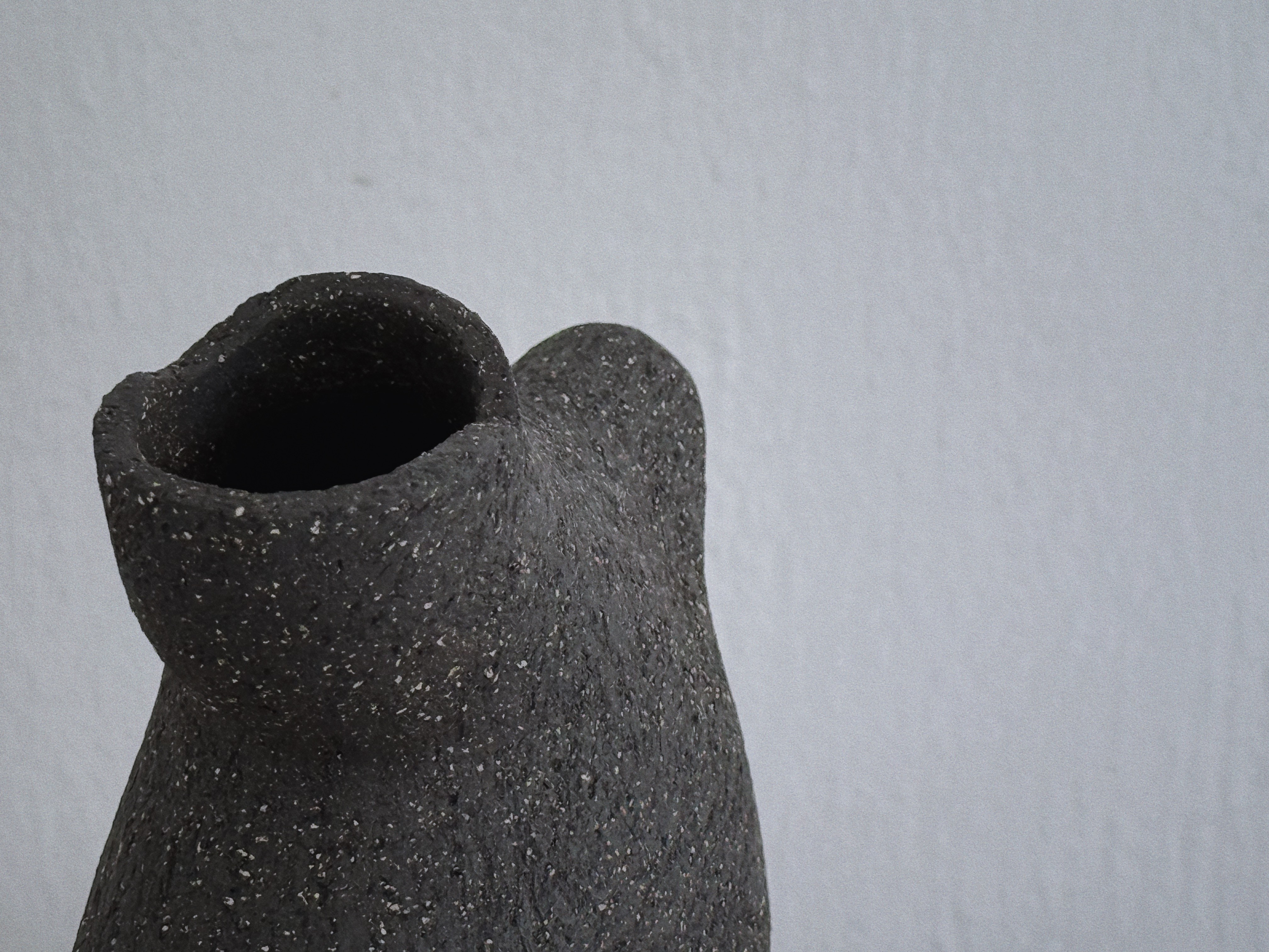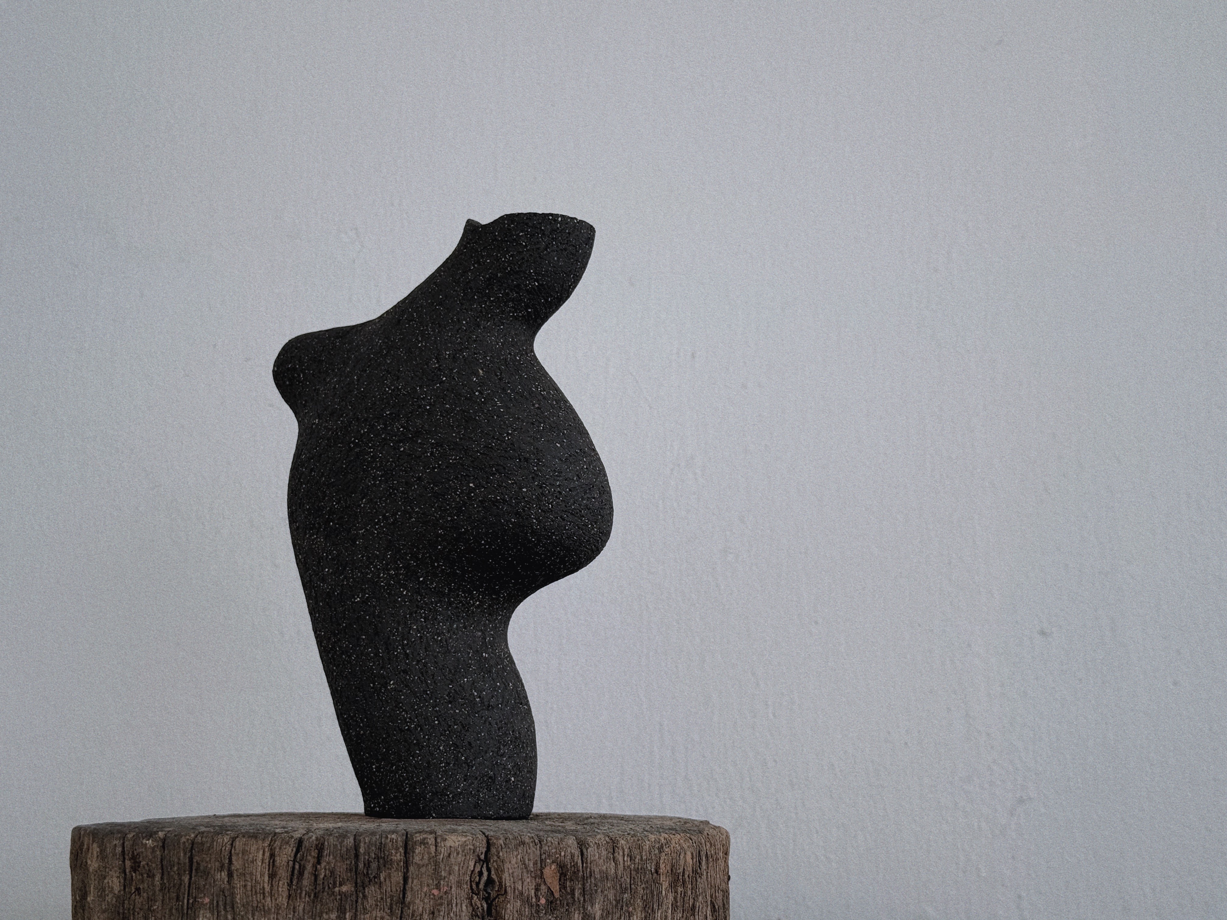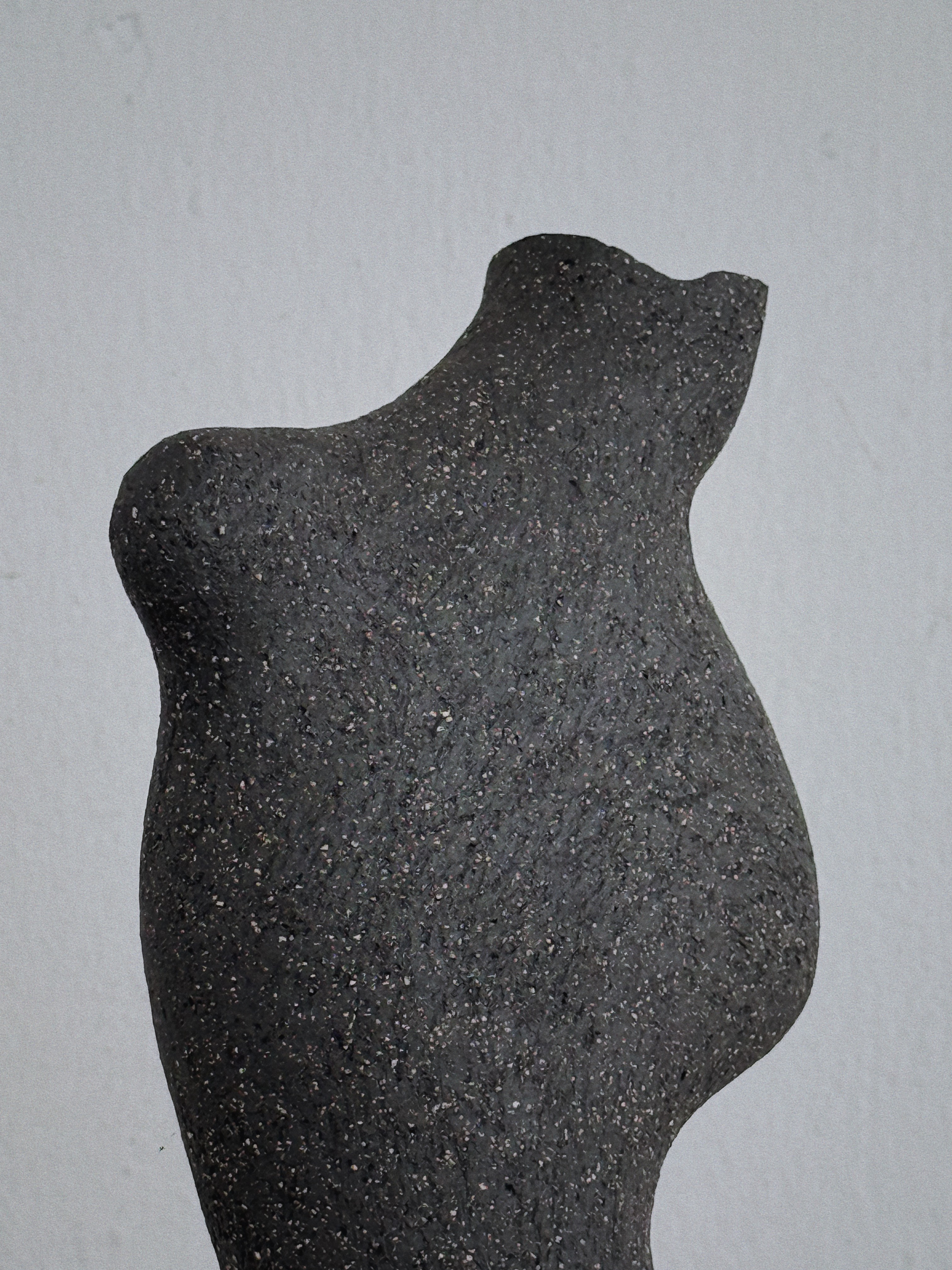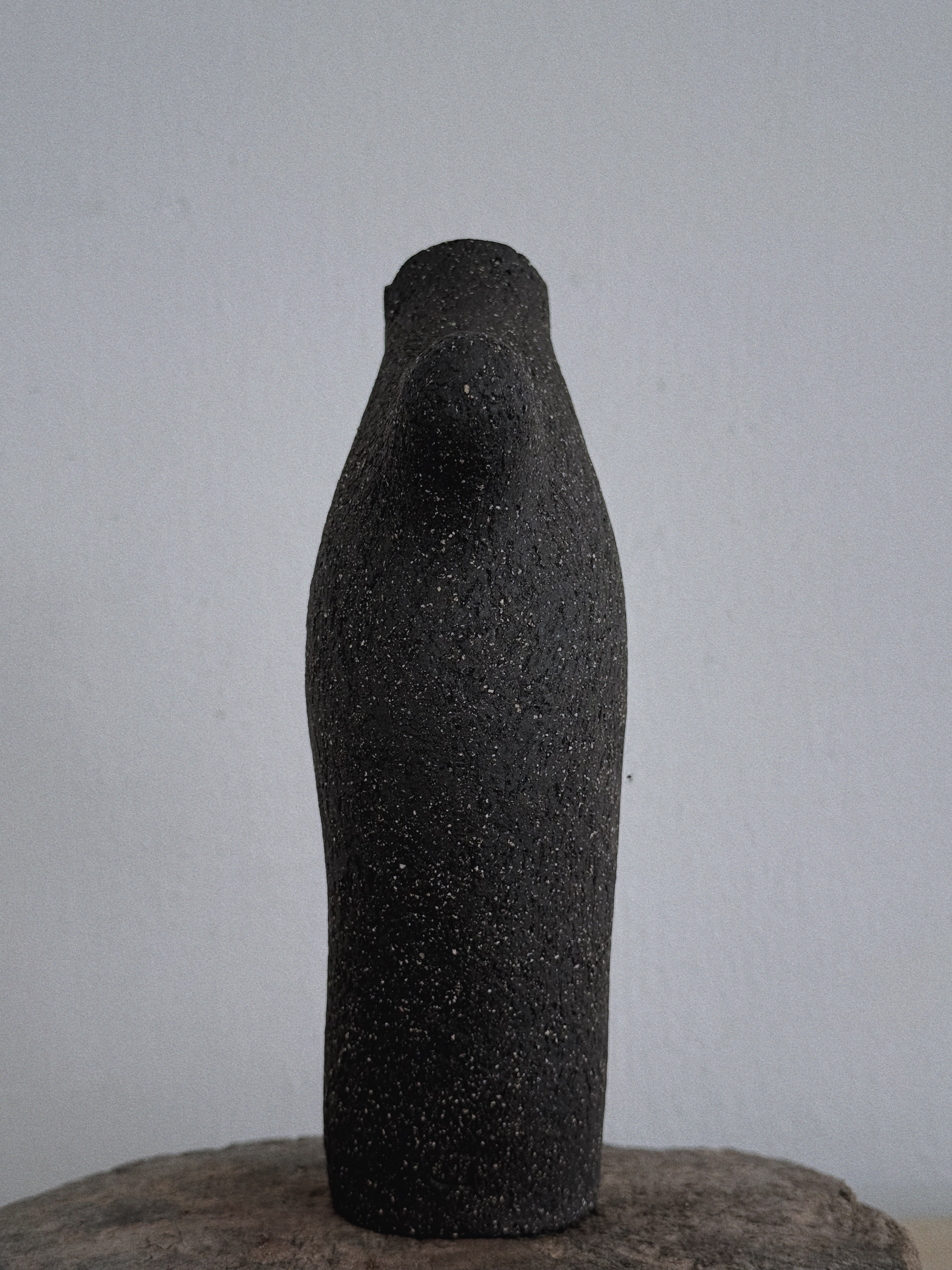 The posture leans forward in a heavy arch, shifting the center of gravity away from its narrow foundation. Dark, speckled grit coats the mass, anchoring the visual weight of the silhouette.