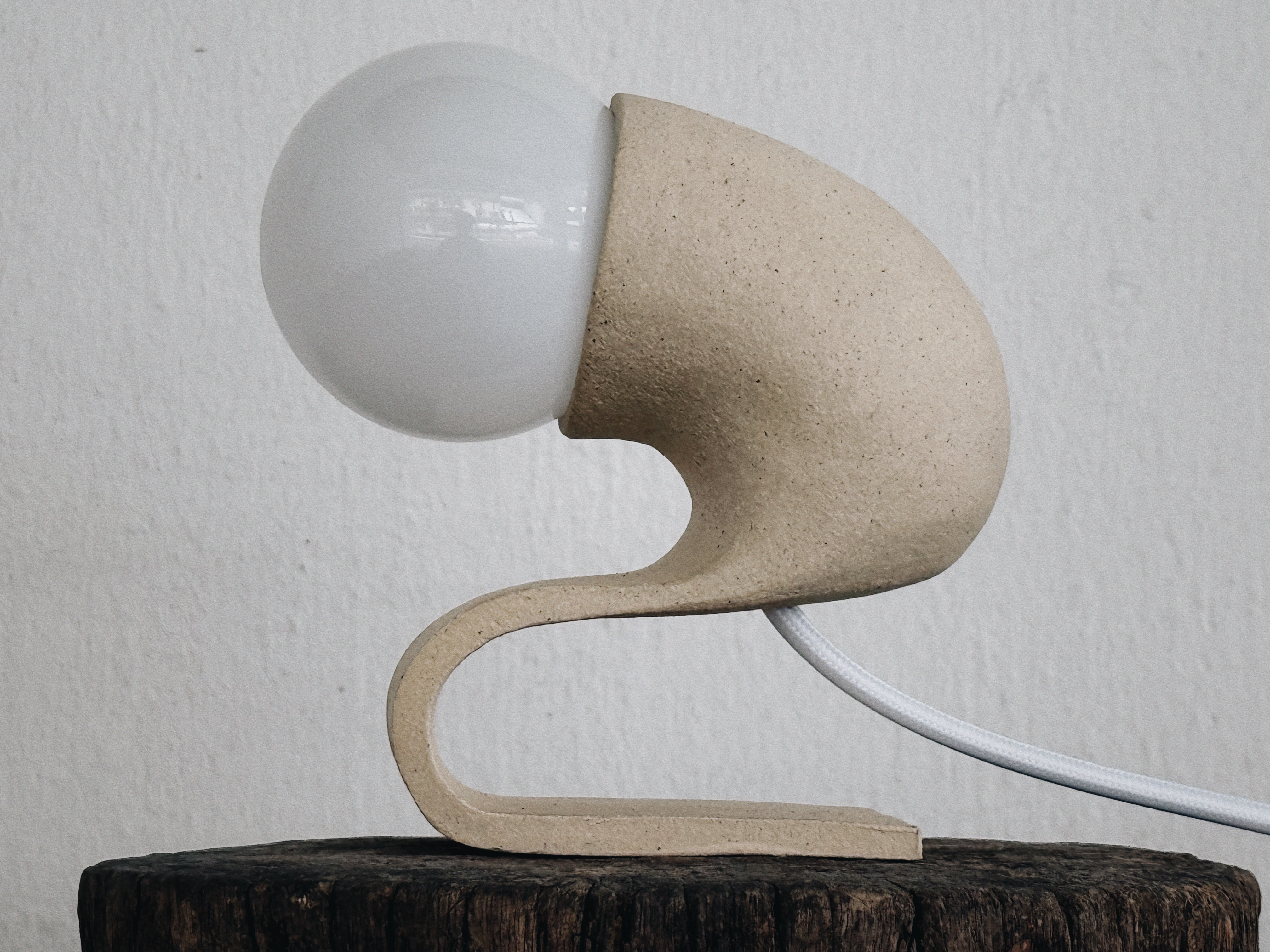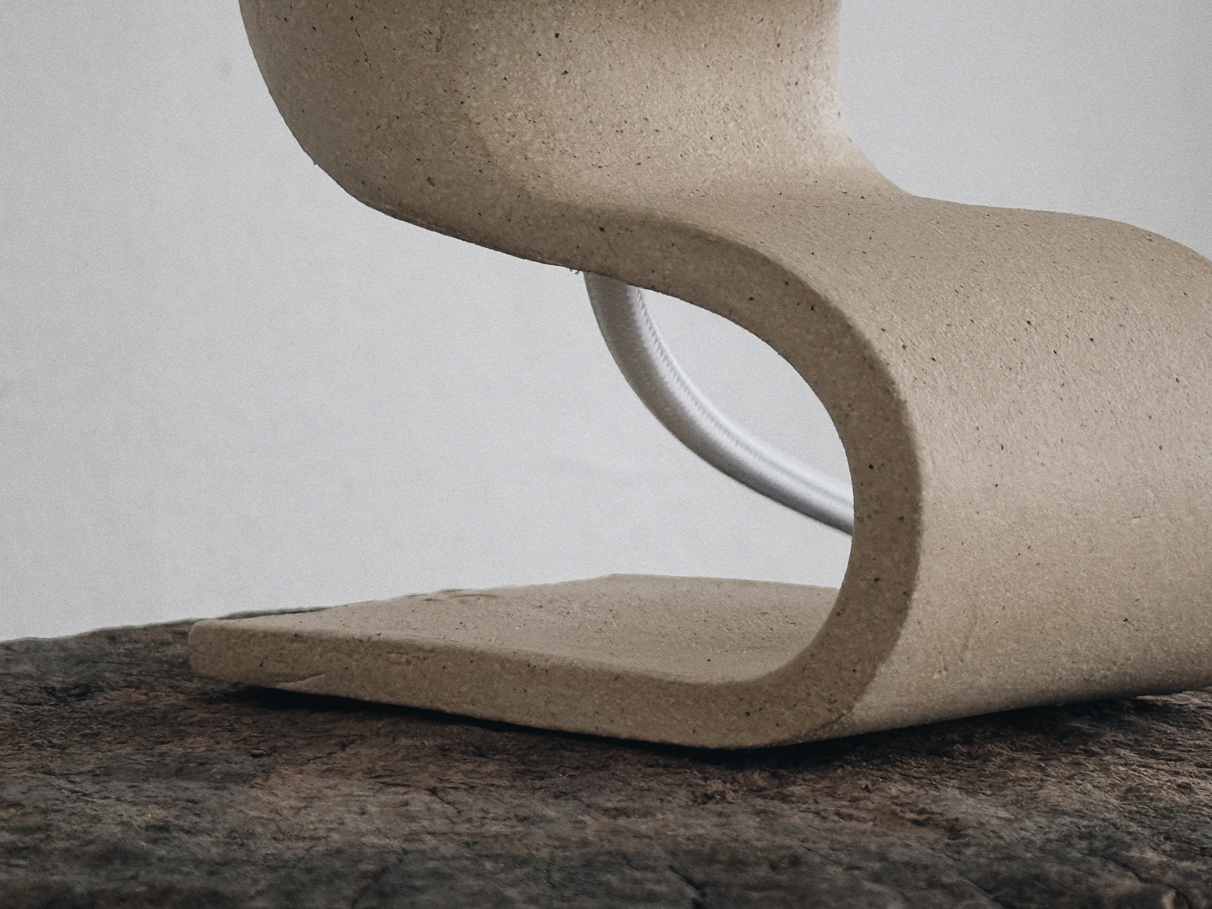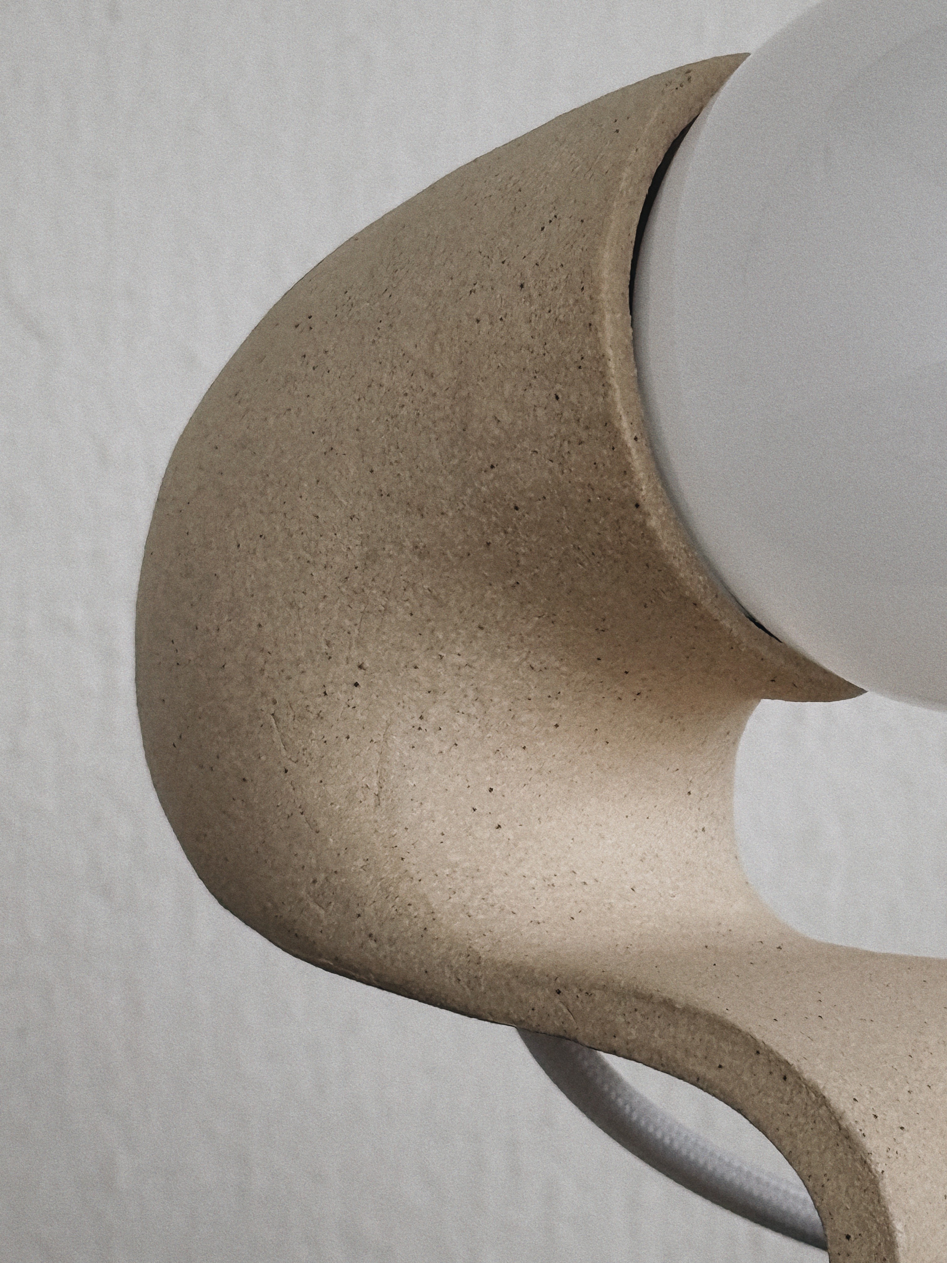 A continuous slab compresses into a seated posture, arching forward to suspend the light. Matte speckled, uniform mass defines the silhouette and the structural tension of the fold.