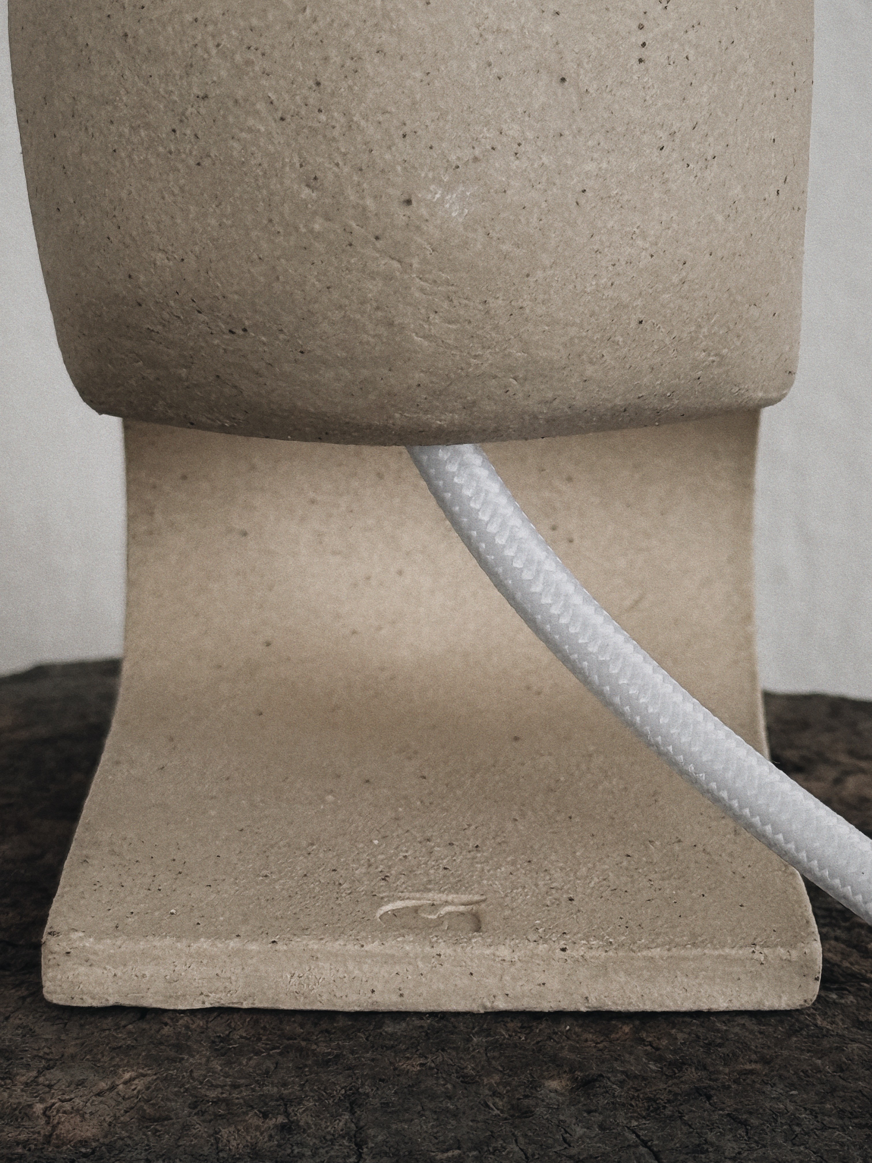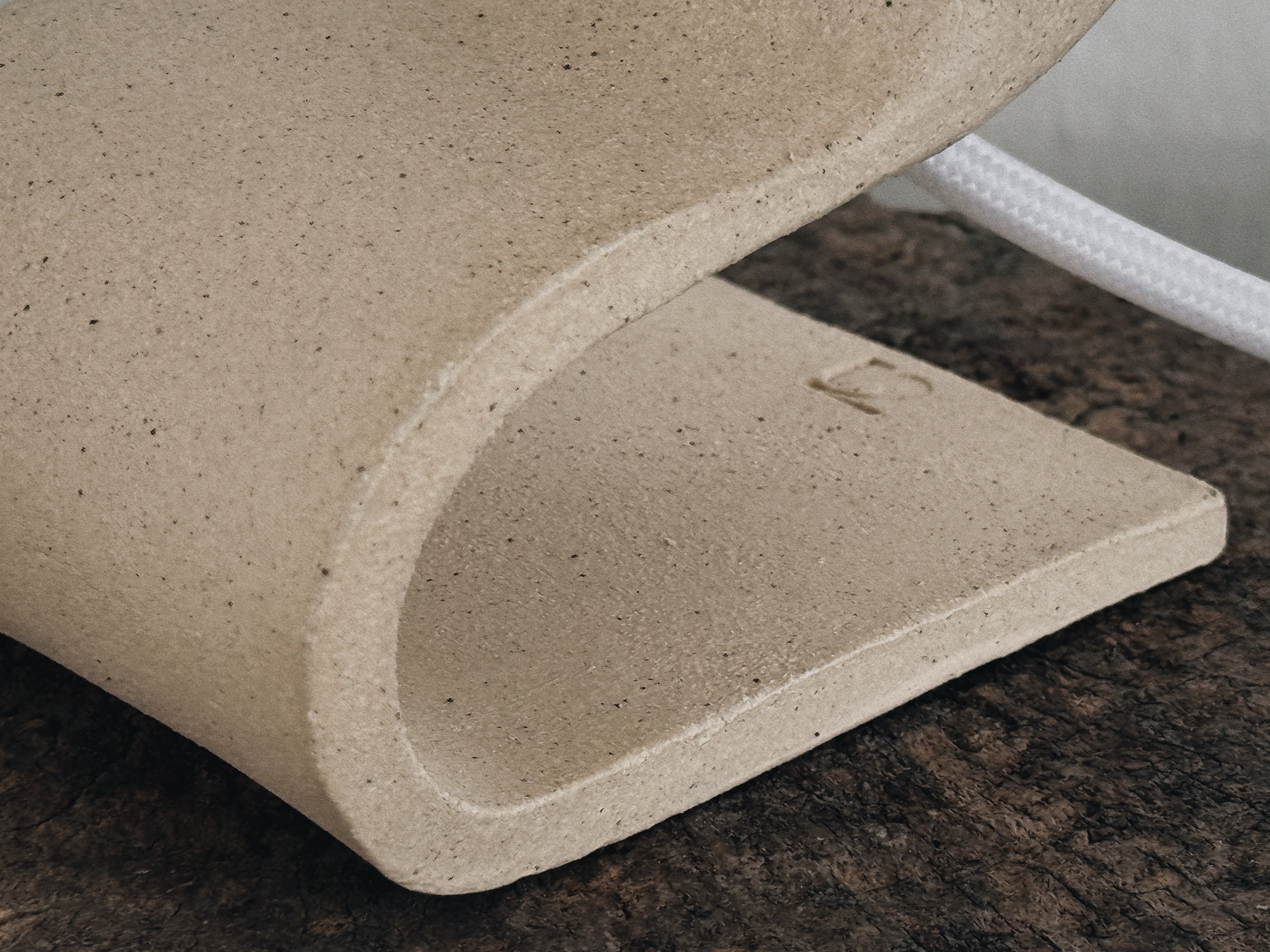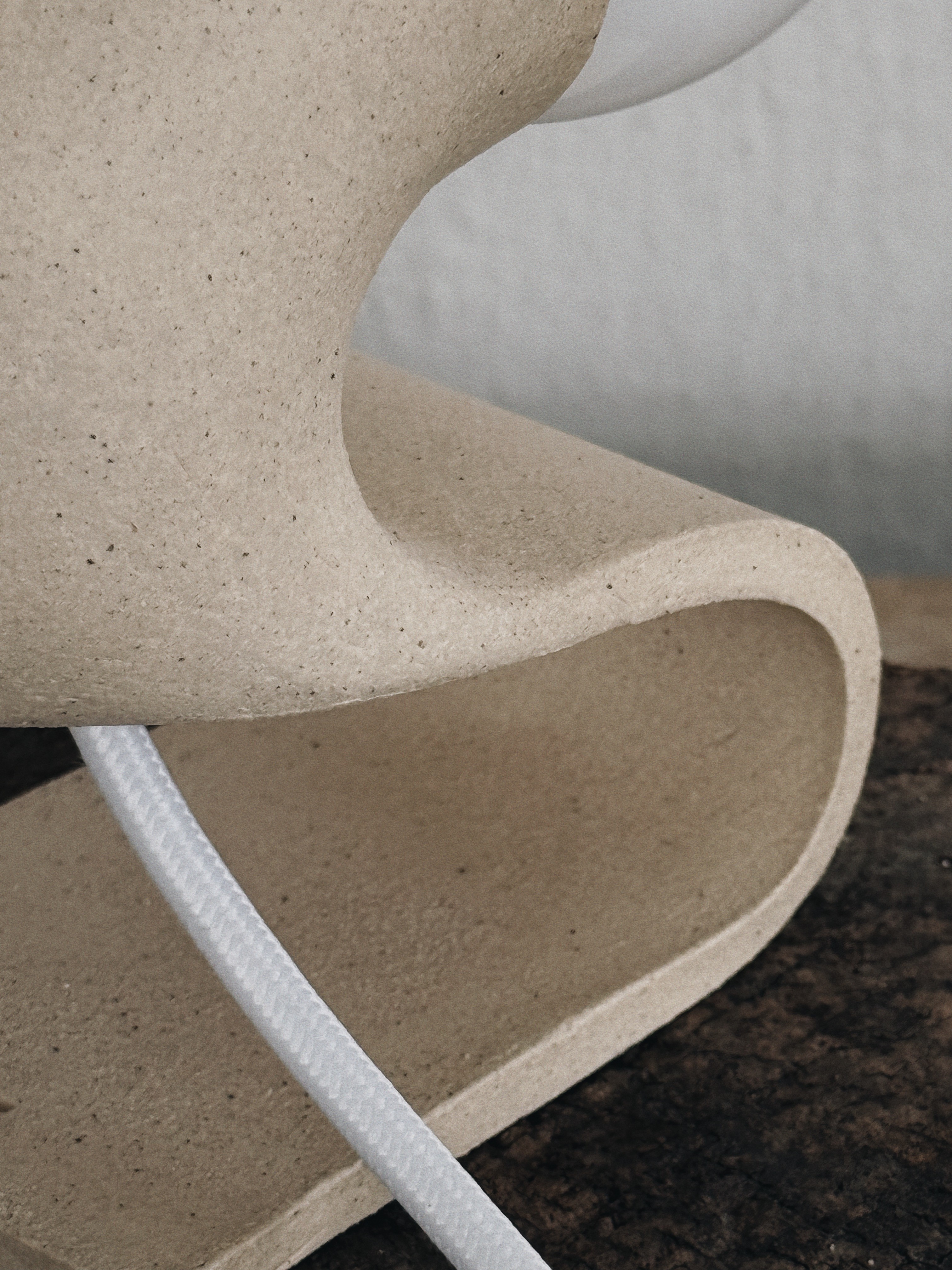A continuous slab compresses into a seated posture, arching forward to suspend the light. Matte speckled, uniform mass defines the silhouette and the structural tension of the fold.