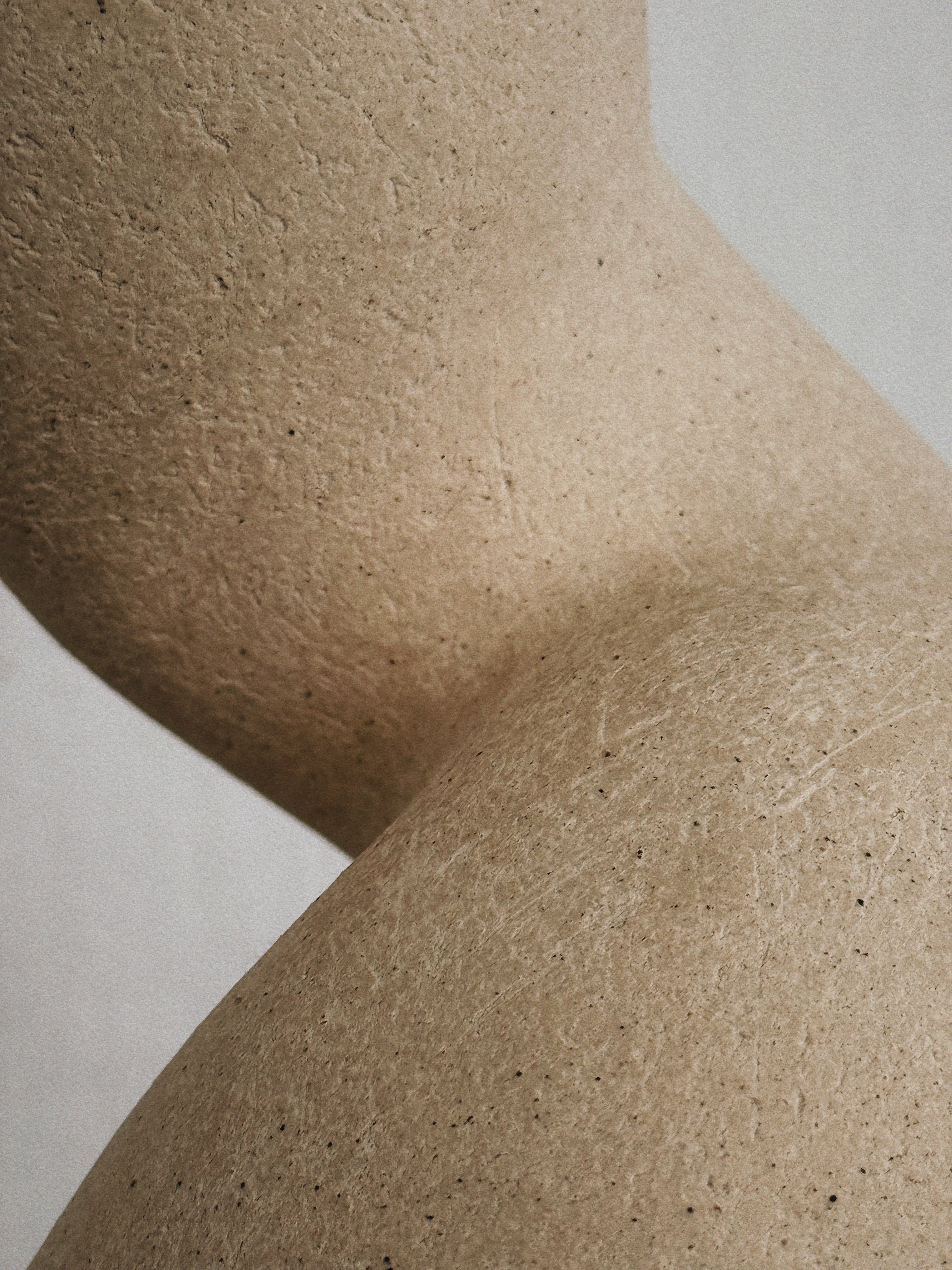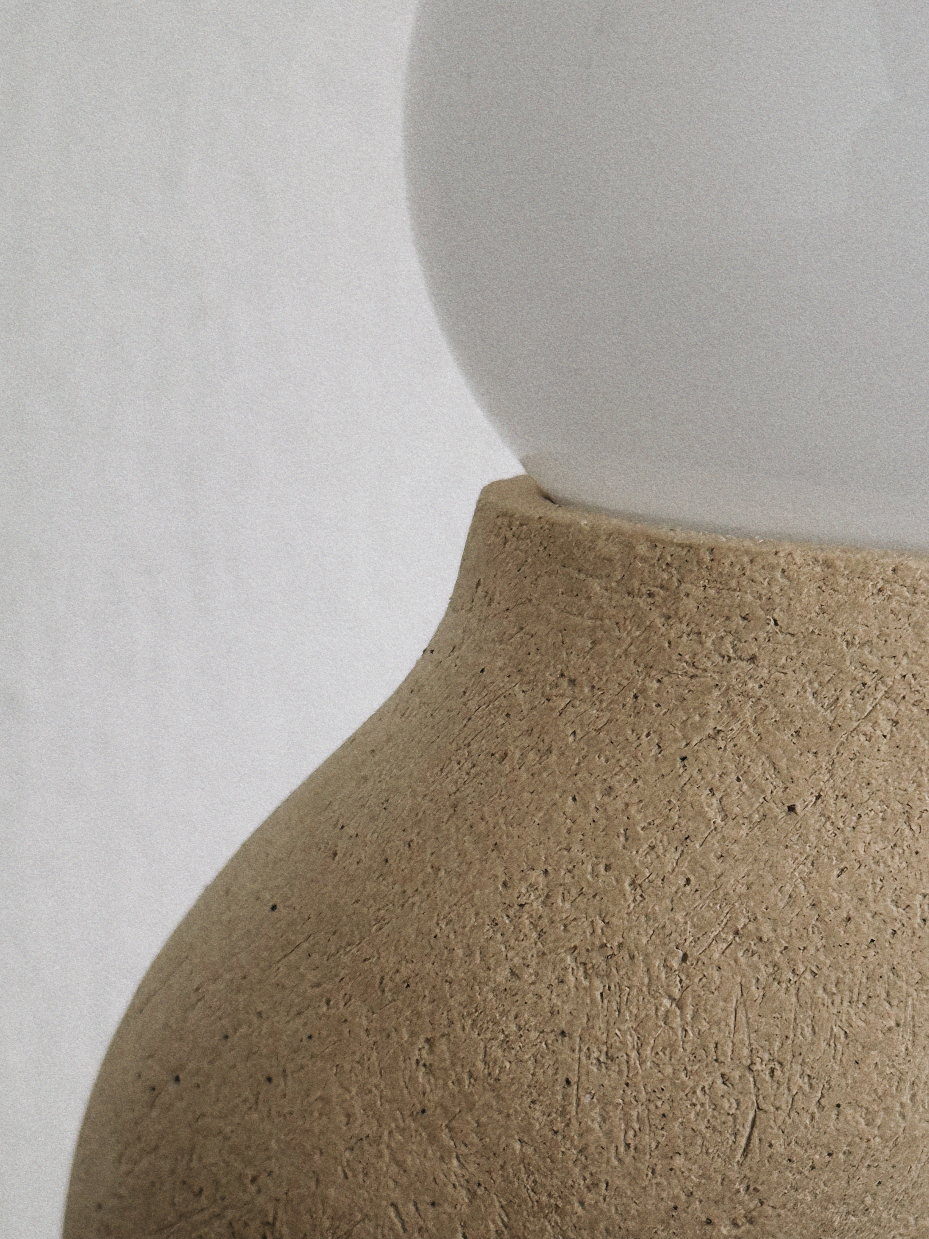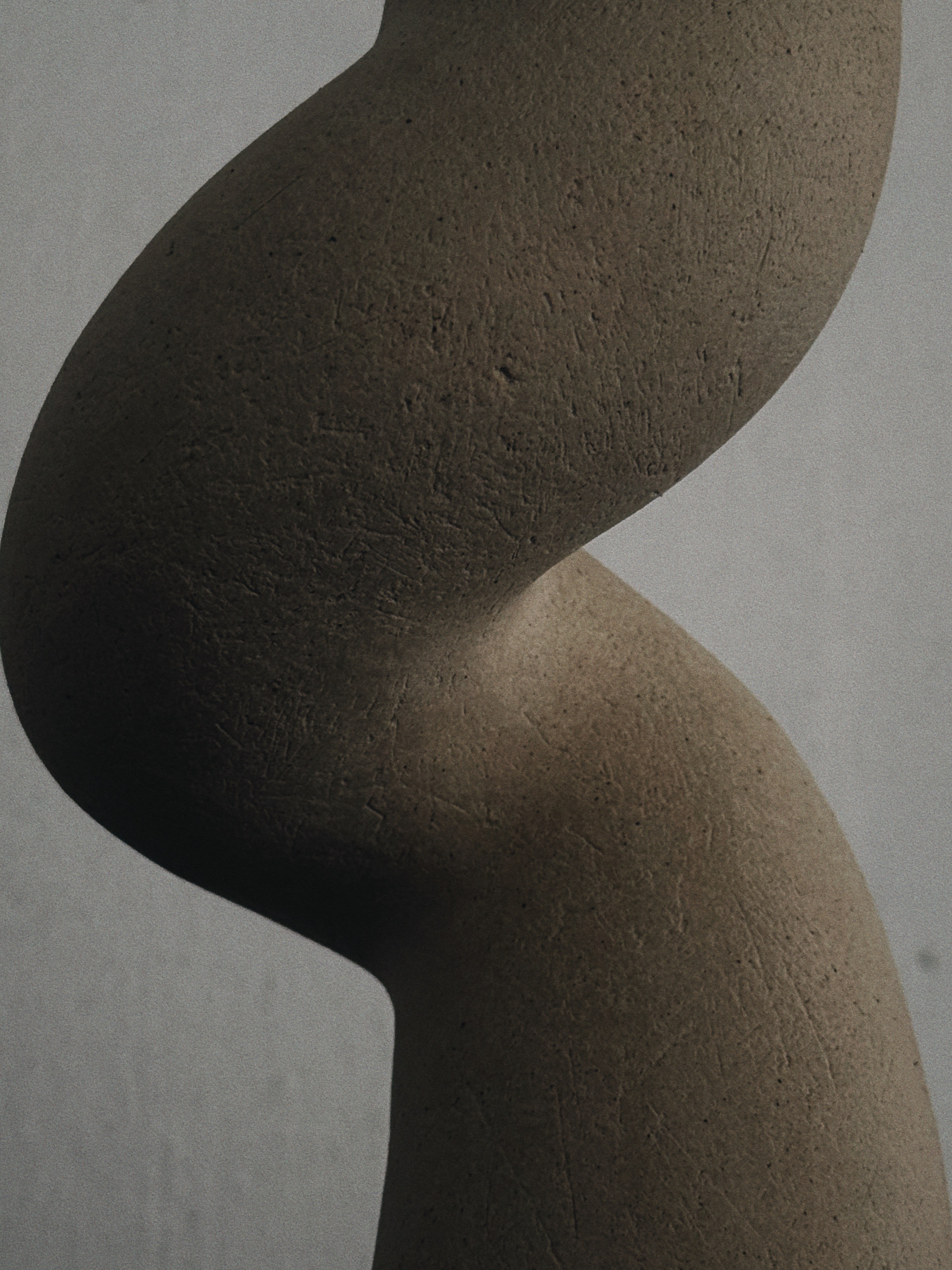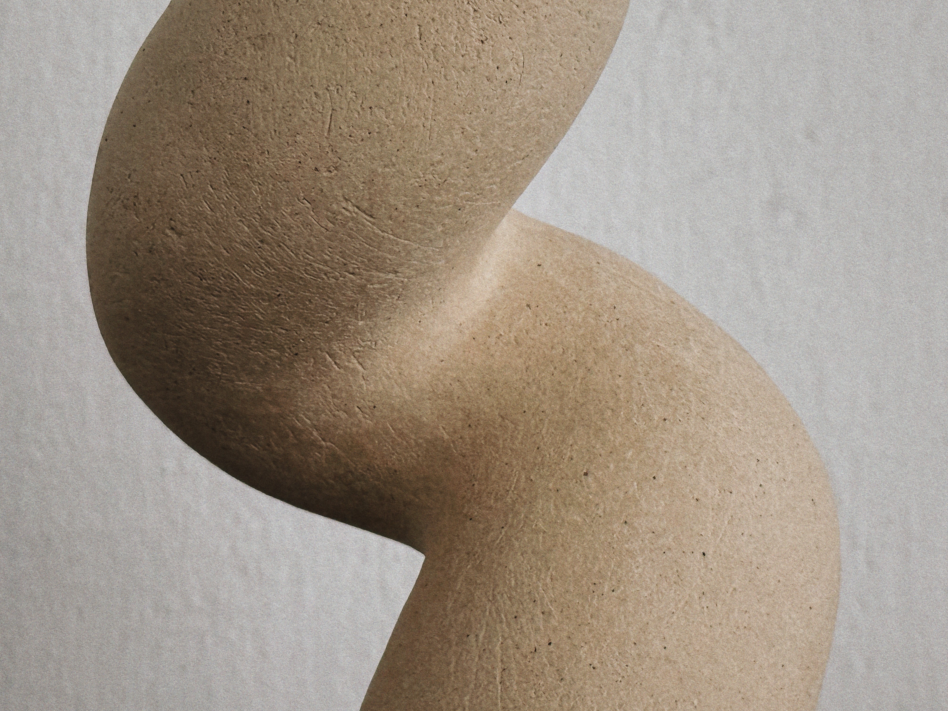A sophisticated bend transitions the vertical mass into a gentle, fluid curve that suspends the sphere. The smooth, speckled surface follows the precision of the arch, resolving the posture with balanced structural poise.