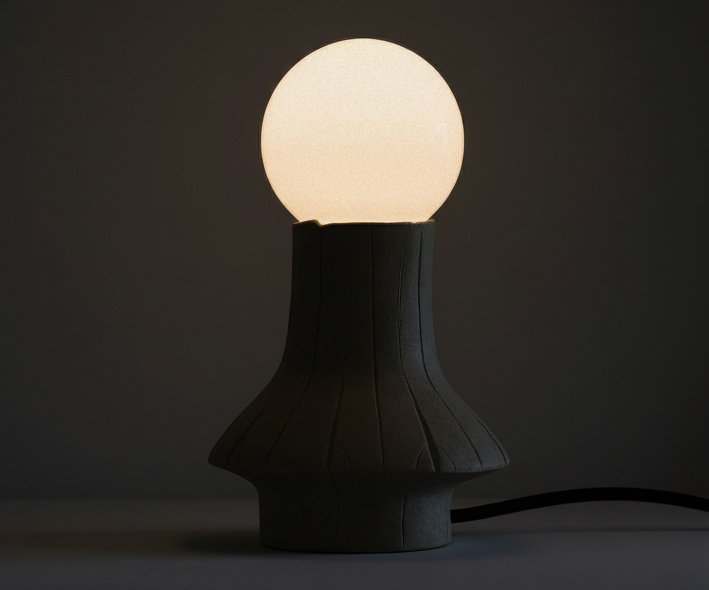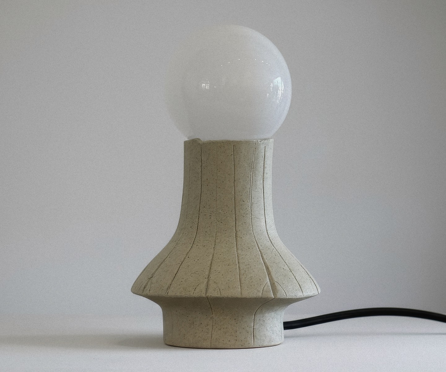 Vertical line markings score the rising mass, creating a mysterious ornament on an otherwise innocent silhouette. The flared foundation stabilizes the posture, while the smooth speckle grit grounds the geometric clarity of the totem.