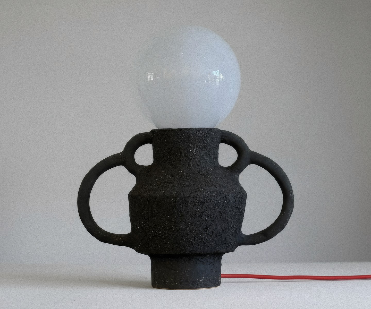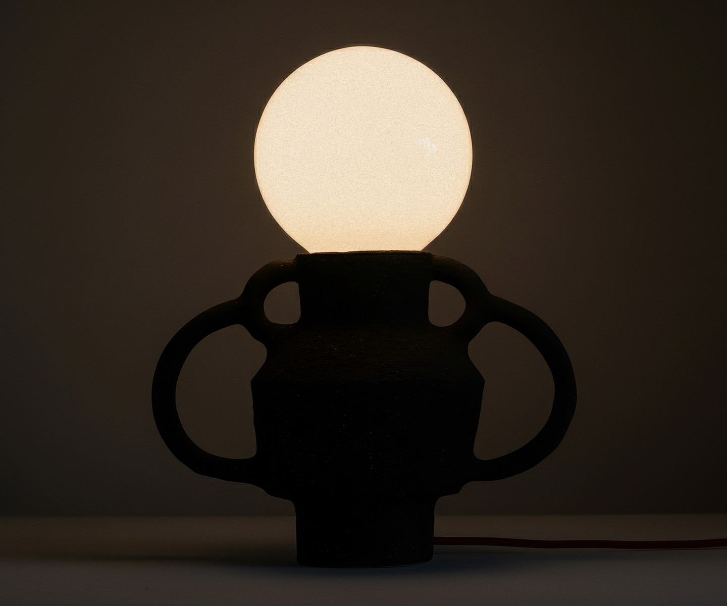 Symmetrical handles flank the weighted torso, establishing a ceremonial presence through balanced, ritualistic proportions. Dark, grit-heavy scoring textures the mass, grounding the centered posture of the luminous bulb.
