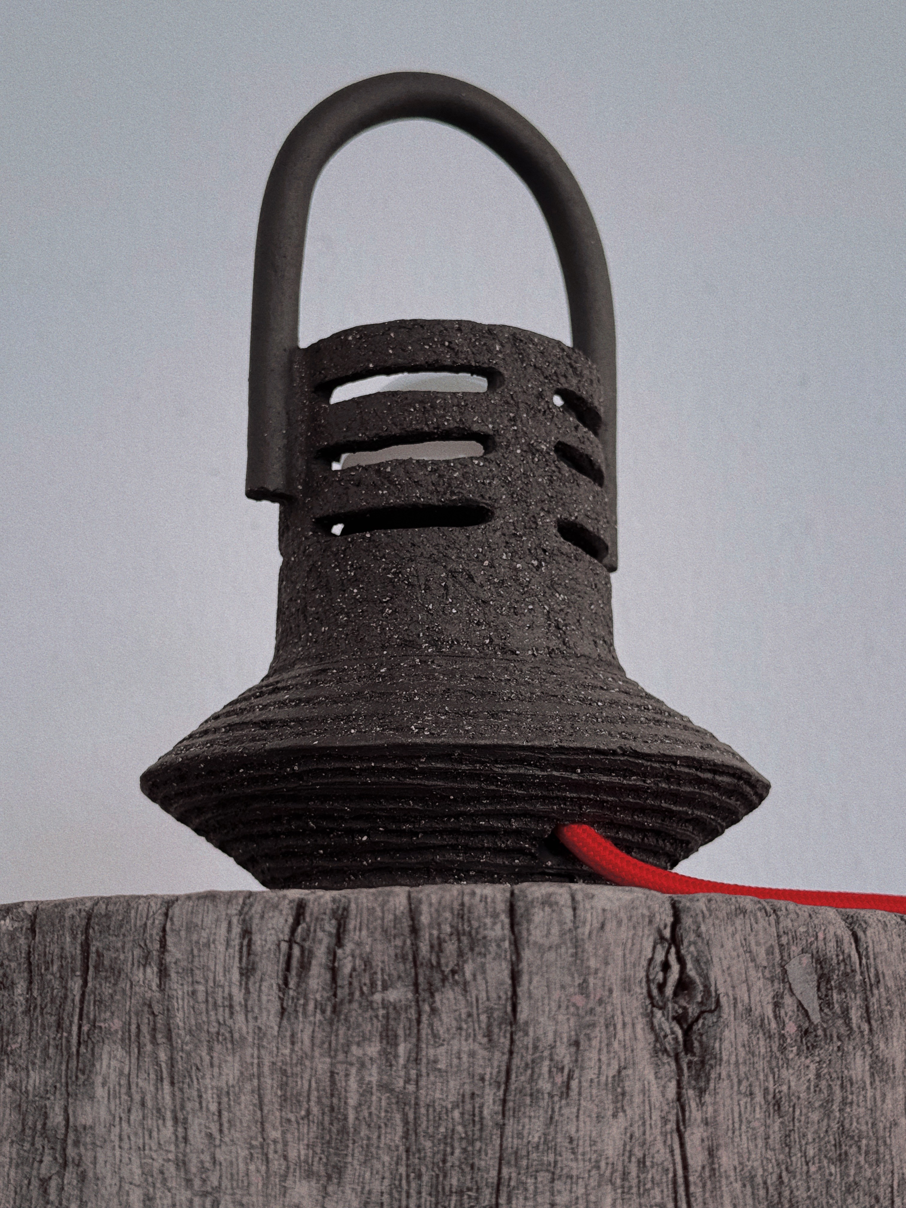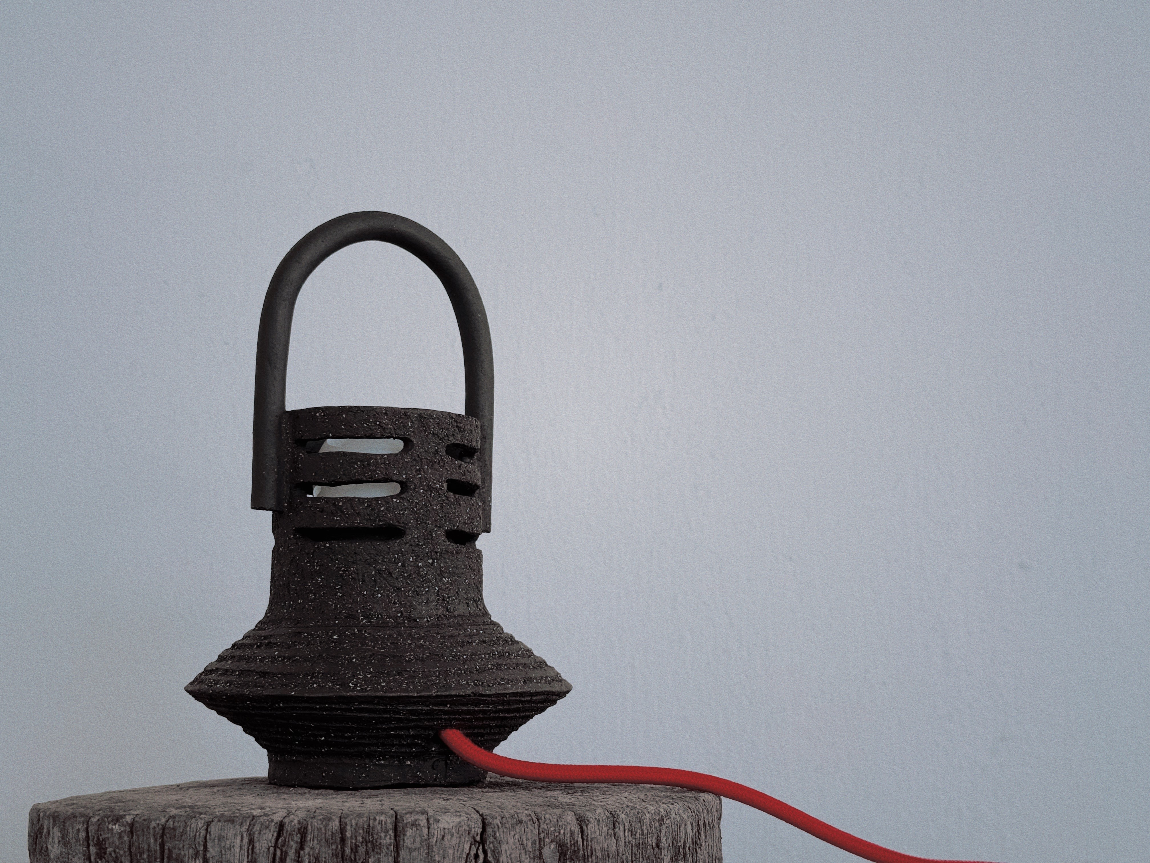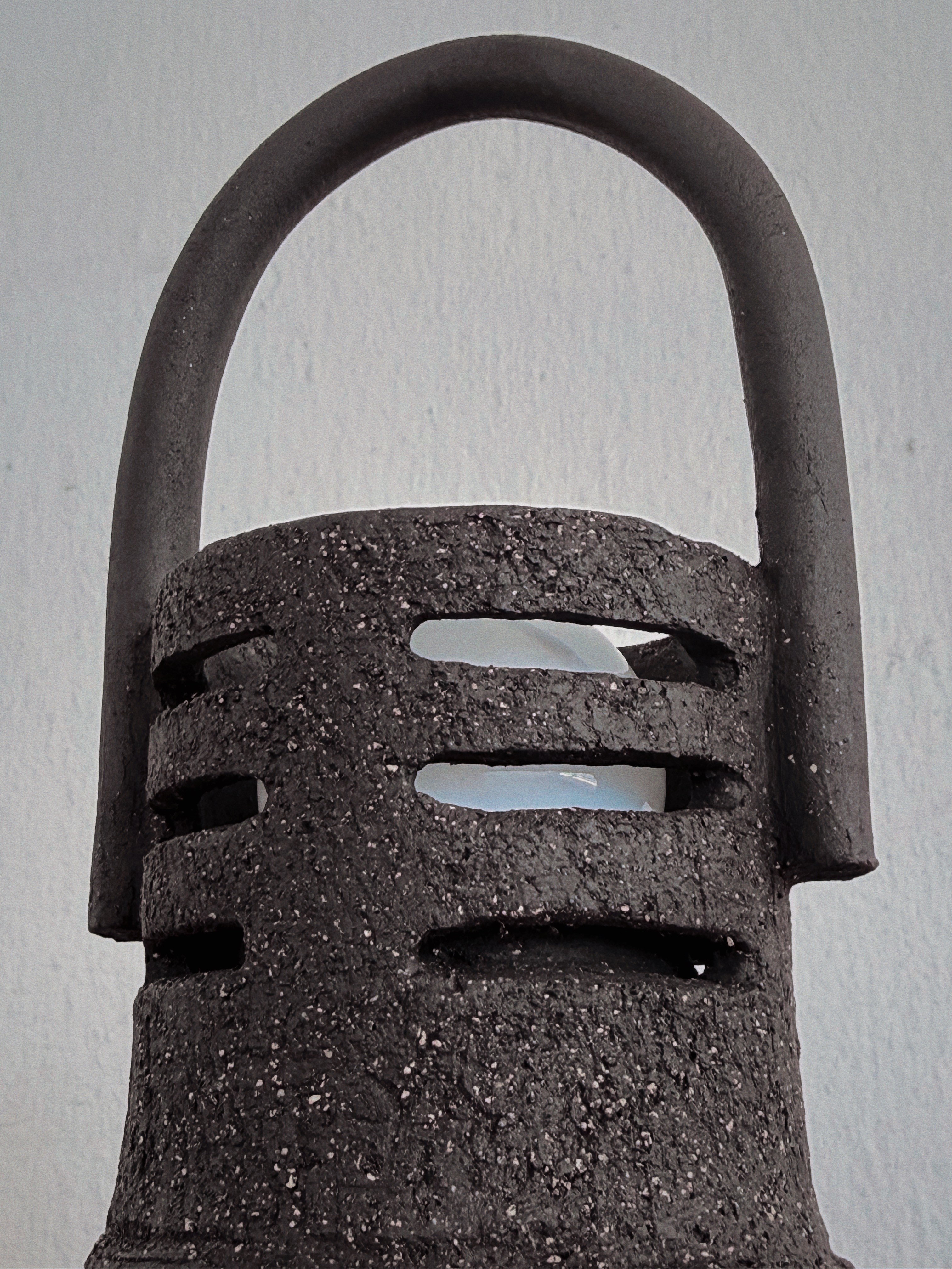 A tall, parabolic handle arches over the perforated mass, suggesting a ceremonial mobility for ritual use. Horizontal scores and dark, coarse gritty marks define the tiered foundation, grounding the light within its vented torso.