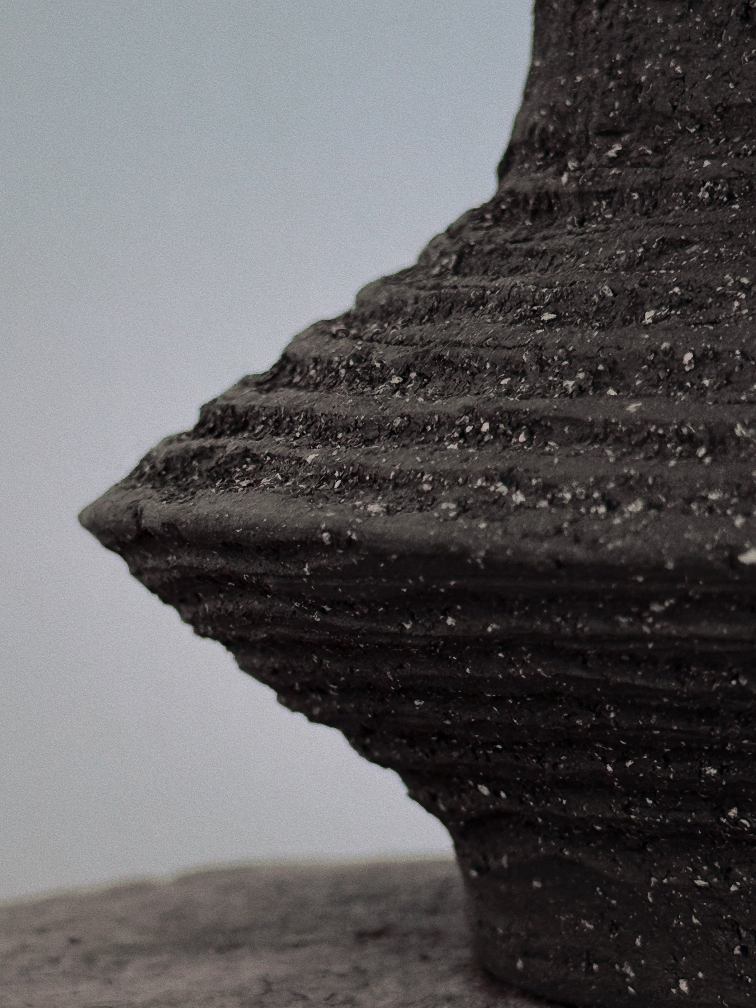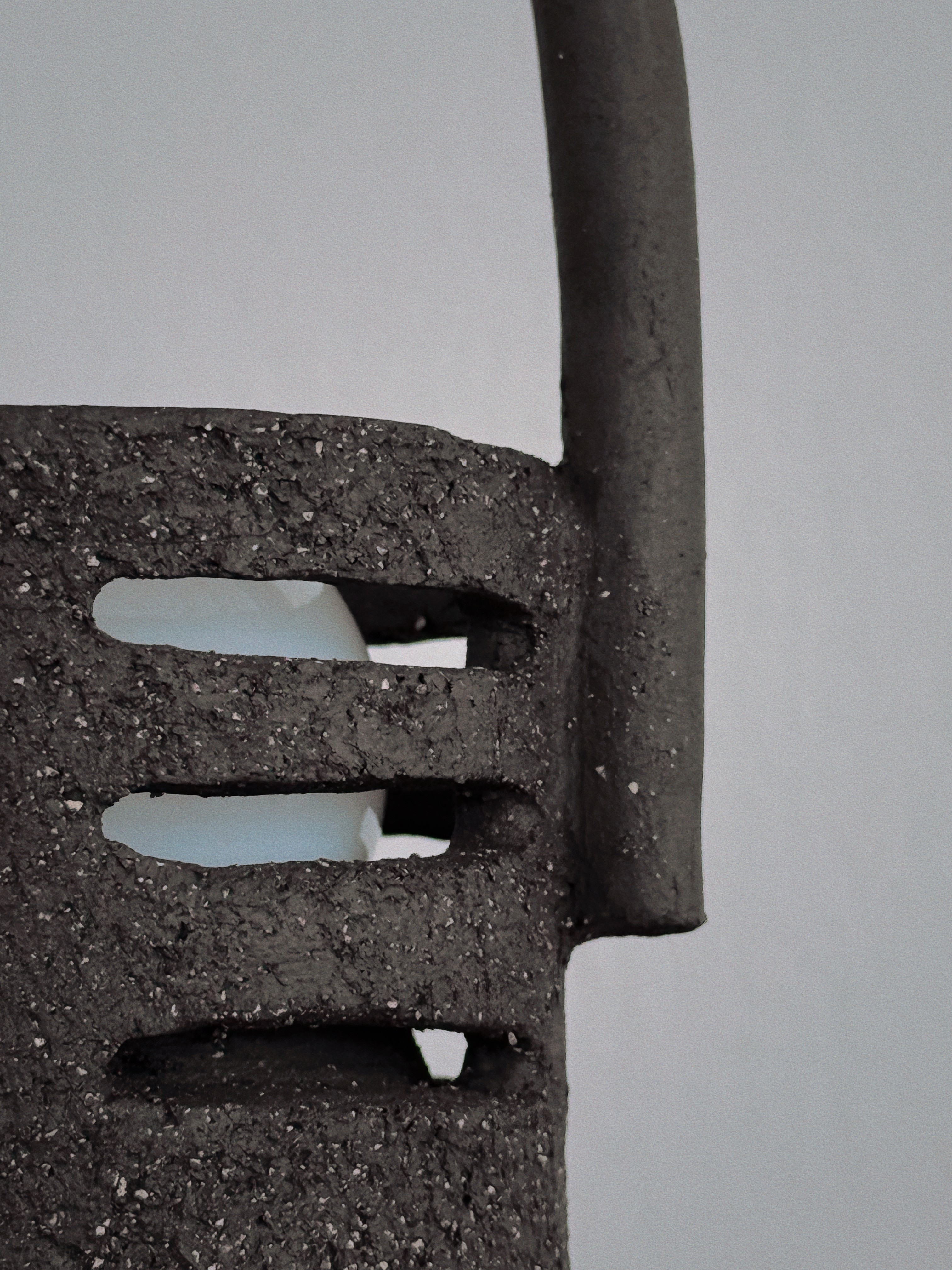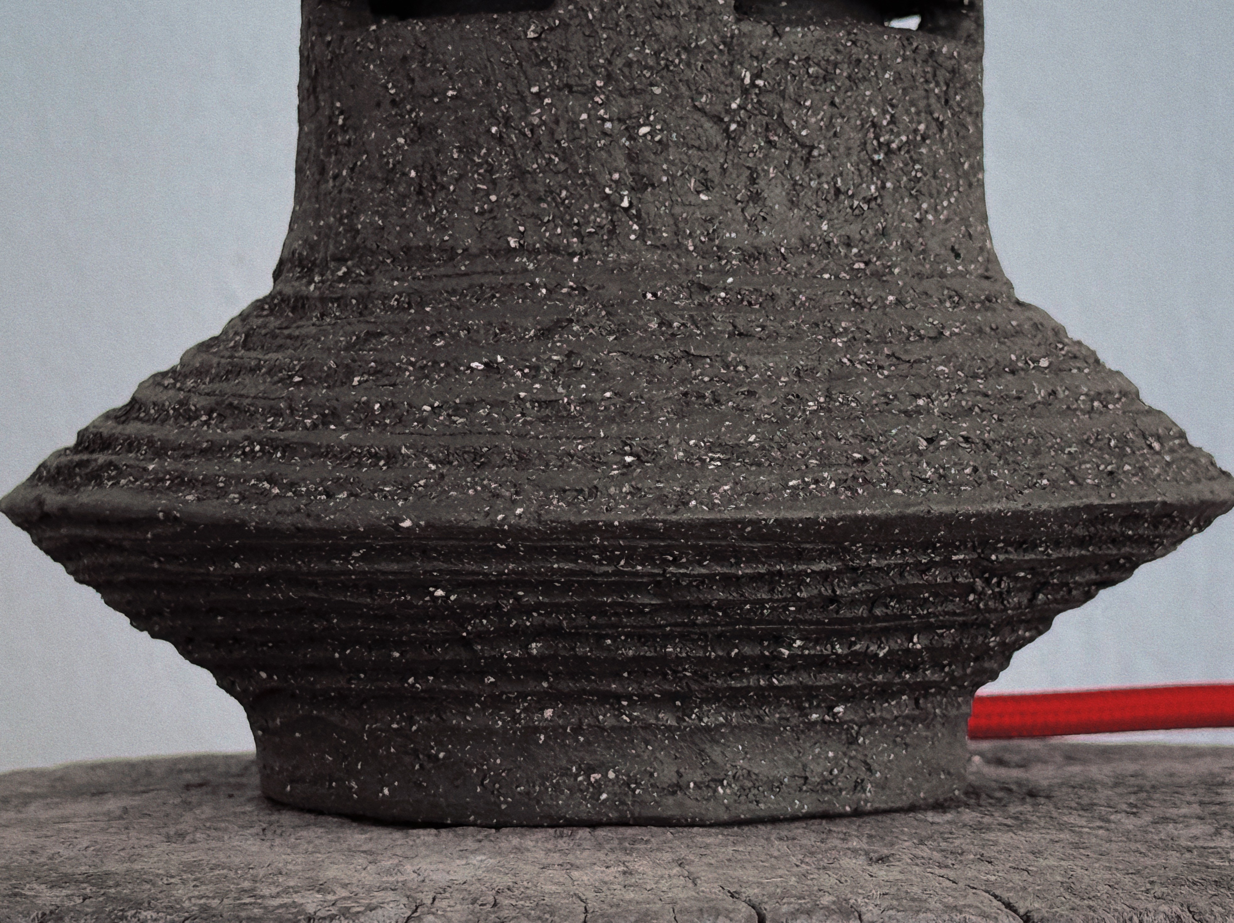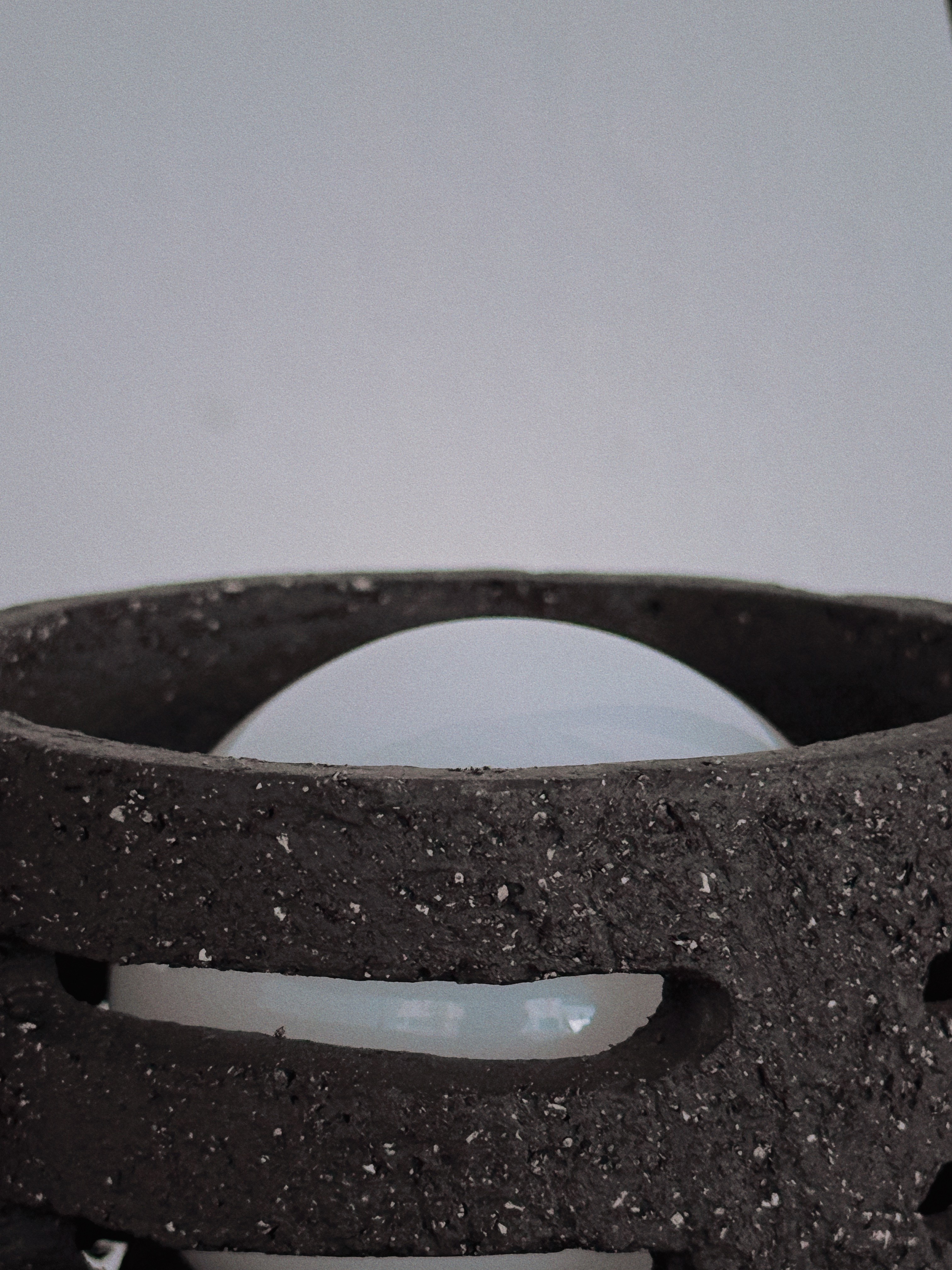 A tall, parabolic handle arches over the perforated mass, suggesting a ceremonial mobility for ritual use. Horizontal scores and dark, coarse gritty marks define the tiered foundation, grounding the light within its vented torso.
