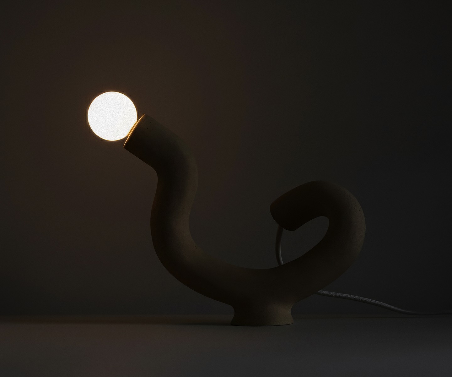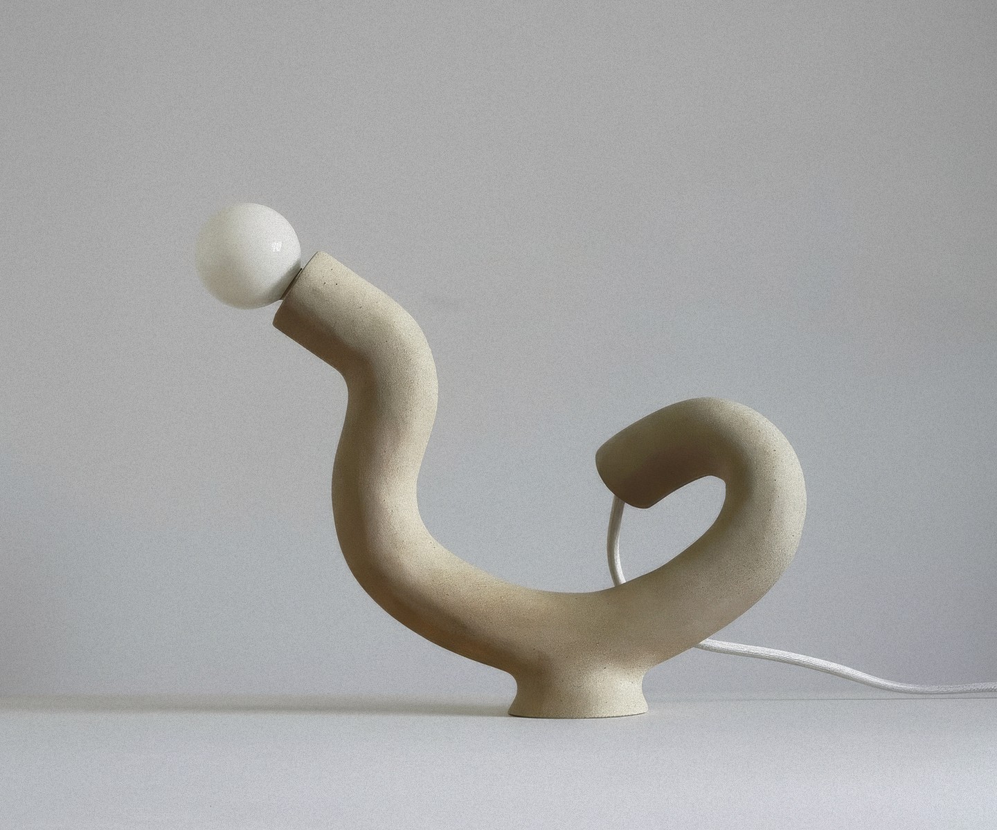 A continuous tubular form coils upon itself, searching for equilibrium through a low, searching posture. The smooth, speckle texture follows the serpentine bend as the mass finds its center of gravity in the curve.